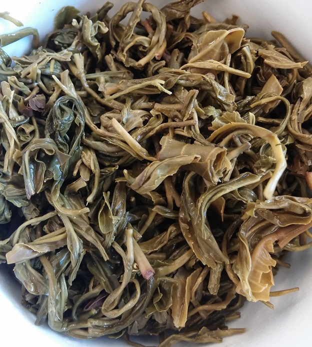 The infused leaves have a uniform fresh forest green color, with some slight variation in the shade. The leaves are mostly medium to large fragments, and there are more whole leaves than I originally estimated. The pluck is two leaves and a fine bud. There are also a few young bare stems in the mix, as well as young buds. The leaves have a soft, smooth texture, and are fairly delicate. Many of the leaves have not fully unrolled, and I believe these leaves may produce a fourth worthwhile infusion.